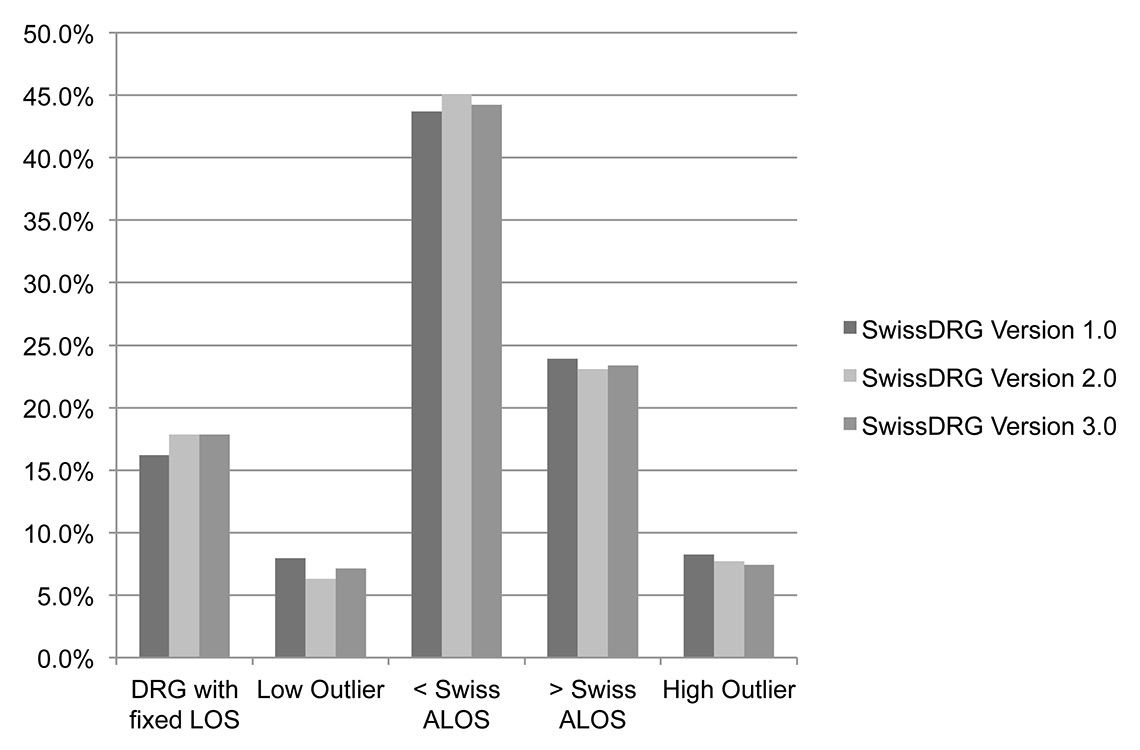 Since for DRG outliers LOS is driving the revenue side of the DRG system also, we analysed the percentage of low and high outliers in our study group under the three consecutive DRG versions, as well as the evolution of total case-mix point reductions and supplements due to changing thresholds for outliers. As figure 2 clearly demonstrates, the proportion of low and high outliers was comparably stable for all investigated SwissDRG versions. The vast majority of the cases are inliers (including DRGs with fixed length of stay) for all investigated SwissDRG versions. Nevertheless, the total sum of reductions for low outliers decreased, especially from SwissDRG 1.0 to 2.0, while the total sum of supplements for high outliers decreased slightly too (table 5). Overall, the proportion of case-mix points compared with the total sum of case-mix points that could be charged under the different SwissDRG versions first increased slightly from 3.8% to 4.0% between SwissDRG 1.0 and 2.0 and then decreased again to 3.5% under SwissDRG version 3.0 (table 5).
