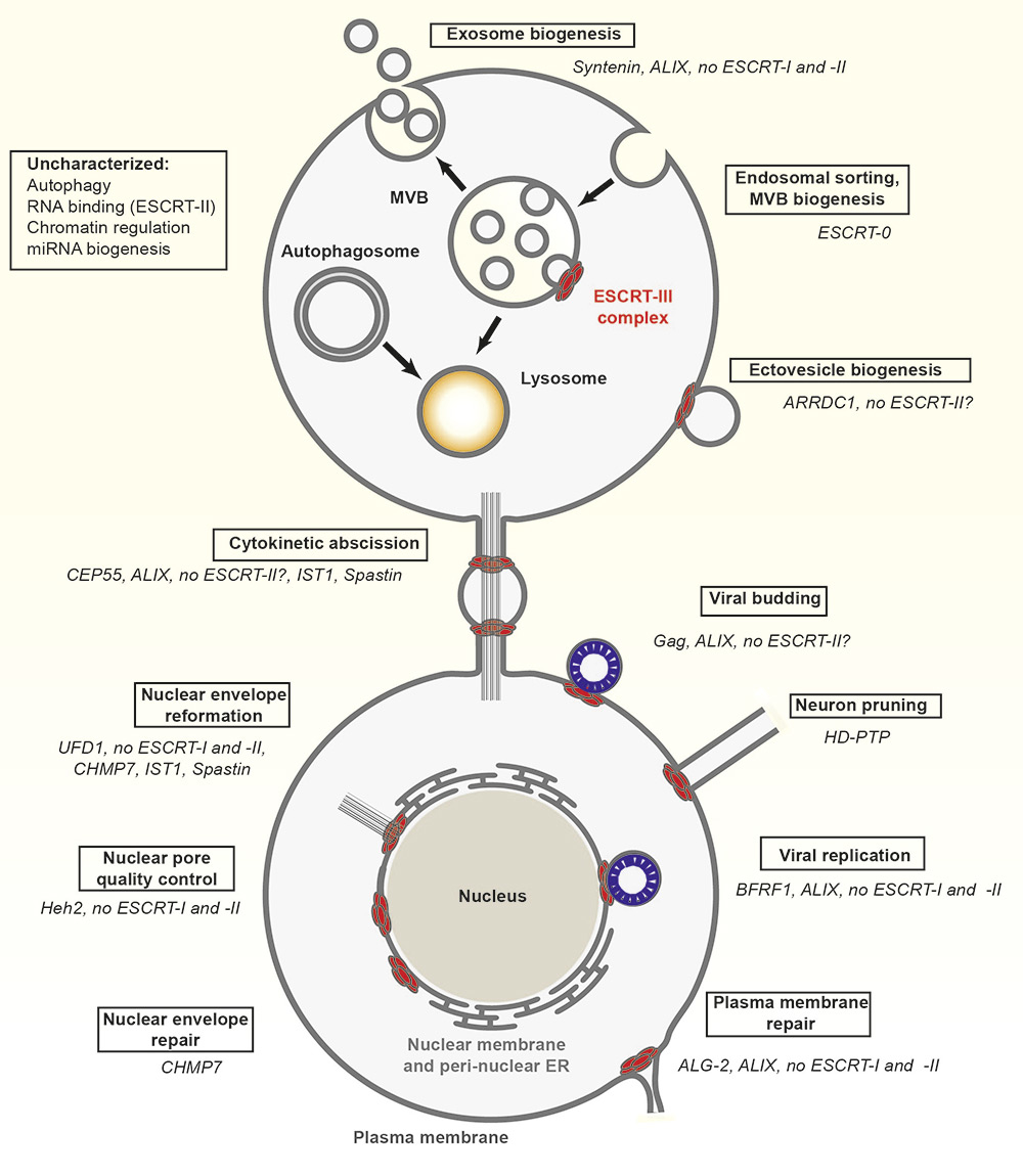 Overview of ESCRT functions throughout the cell. Factors that are specific for each ESCRT-dependent process (boxed) are listed in italics.