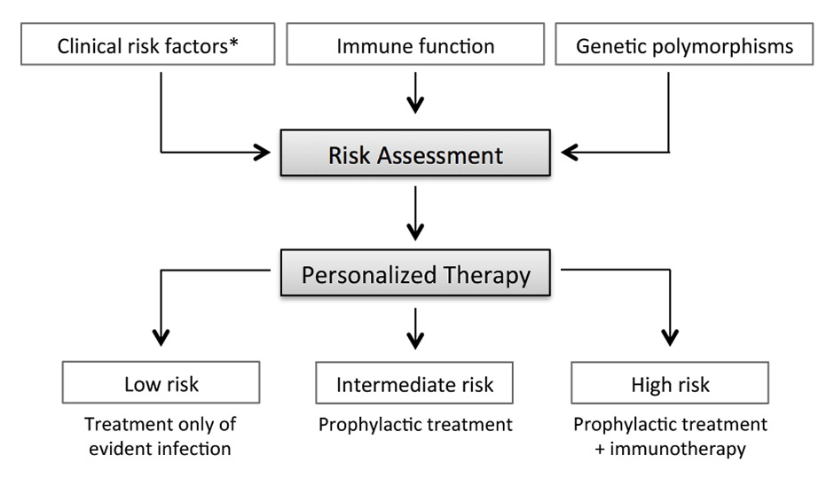 Techniques such as high throughput SNP genotyping (e.g., large arrays of selected SNPs) or genome-wide association studies (GWAS) have become more easily accessible in the clinical setting. Therefore, the chance to assign each patient an individual risk score based on the genetic background of the donor and/or the recipient is coming within reach. This knowledge might lead to personalised prophylaxis and treatment schemes comparable to the approach used in modern oncology and would counter overtreatment with antifungal therapy (fig. 2).
