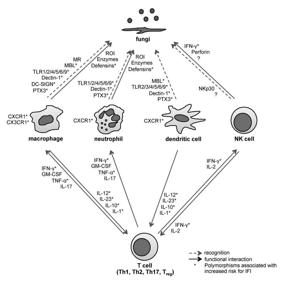 NK cell = natural killer cell; MR = mannose receptor; MBL = mannose-binding lectin; TLR = Toll-like receptor; PTX3 = pentraxin 3; ROI = reactive oxygen intermediates; IFN = interferon; GM-CSF = granulocyte macrophage colony stimulating factor; TNF = tumour necrosis factor; IL = interleukin ; IFI = invasive fungal infection