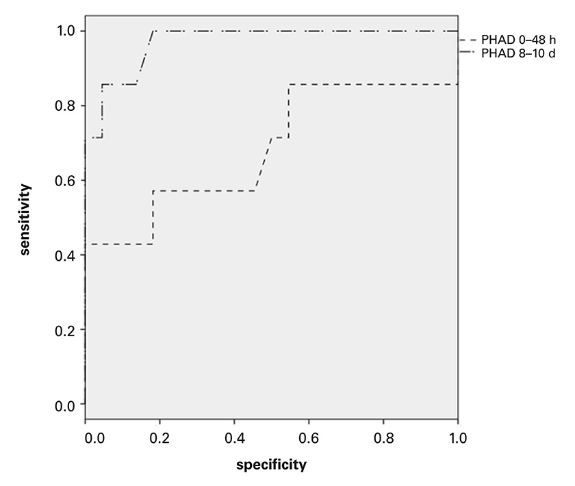At a first glance, the lack of prognostic power at an early time-point seems to contradict the prognostic value of the PHAD reported by Broadley et al. [18]: however, the difference is explained by a different, refined methodology as well as by a different observation period as proposed by other study groups (see below):