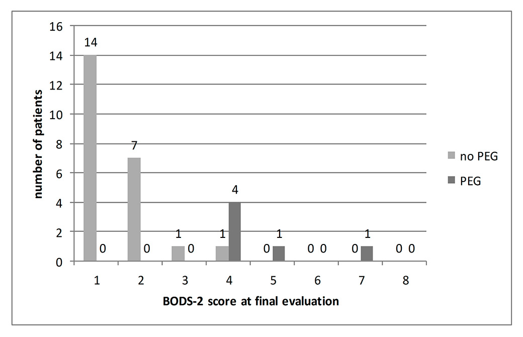 BODS-2 (Bogenhausen-dysphagia-score, part 2) assessed 5–7 weeks after a stroke (final evaluation) in the group with “extended risk of aspiration” (n = 29). PEG indicates individuals with percutaneous endoscopic gastrostomy. Note partitioning into groups (i) BODS-2 <4 and (ii) BODS-2 ≥4. The latter, representing the group of “prolonged impairment of deglutition” (n = 7), had to be predicted from the PHAD score.