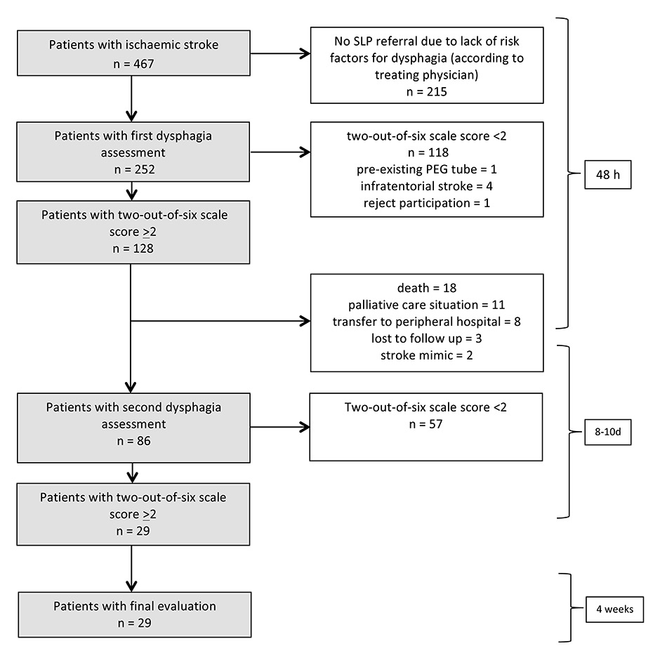 First and second dysphagia assessments consisted of: comprehensive dysphagia assessment including the two-out-of-six scale. If the two-out-of-six scale score was ≥2 the Parramatta Hospitals’ Assessment of Dysphagia was added by a speech-language pathologists (SLP) who was unaware of the other dysphagia and clinical assessments. First assessment was performed within 48 h after stroke onset and the second 8–10 d after stroke onset. The final evaluation was performed by an SLP blinded to clinical follow up and consisted of a telephonic interview with assessment of the BODS-2 scale (Bogenhausen-dysphagia-score, part 2) 4 weeks after the second assessment (5–7 weeks after stroke onset).