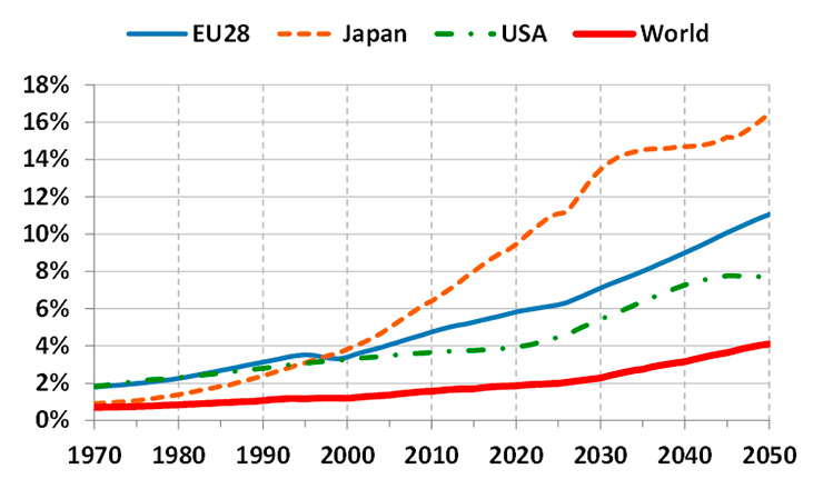 A main driver behind the global healthcare crisis is population ageing, a demographic phenomenon that is quickly progressing across the globe. According to the Organization for Economic Co-operation and Development (OECD), the percentage of the worldwide population over 80 years old is currently around 2%, but this number is expected to reach 4% by 2050 [1]. The situation is more severe in developed countries, where life expectancy is longer. For example, the population over 80 years old in Europe is currently around 5% and is expected to reach 11% by 2050 (fig. 1).