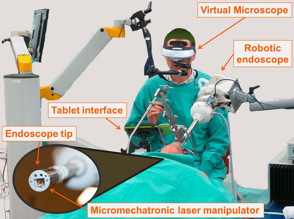 To address the first two limitations, an international multidisciplinary research consortium funded by the European Commission and led by IIT developed the endoscopic laser phonomicrosurgery system µRALP [69, 74]. The system, presented in figure 8, miniaturises the traditional surgical setup and places the imaging and laser actuation devices on the tip of a flexible endoscope that can be inserted into the throat of the patient, thus eliminating current requirements for a direct line of sight. Stereoscopic imaging is provided by two miniature cameras that allow augmented-reality visualization of the surgical field through a virtual microscope interface [51, 55]. The surgical laser beam is delivered through a flexible optical fibre to the tip of the endoscope, where it is controlled by a micromechatronic laser manipulator [75] using commands directed by the surgeon through the tablet interface.