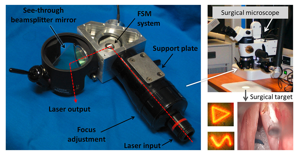 Given the challenges and limitations associated with this surgical procedure, laser phonomicrosurgery is a prime application area for robotics [68]. This is an area where new technologies can significantly impact surgical capabilities and outcomes. For this reason, multidisciplinary collaborative research between the Istituto Italiano di Tecnologia (IIT, Genoa, Italy) and the San Martino Hospital (UNIGE, Genoa, Italy) has focused on the development of innovative robot-assisted systems for this specific application. The research has resulted in the creation of a motorised and fully programmable laser micromanipulator device (fig. 5) that eliminates a major limitation of current laser microsurgery systems: the unassisted manual control (using a mechanical joystick) of the laser beam. The IIT laser micromanipulator is based on a fast steering mirror, offering rapid and highly accurate robotic control of the laser beam motions with precision and repeatability of 4 µm at the typical operating distance of 400 mm [70]. These specifications allow the system to accurately scan the laser over trajectories defined in real time by the surgeon, greatly enhancing the quality of laser-tissue interactions and the precision and safety of the surgical operations [56].