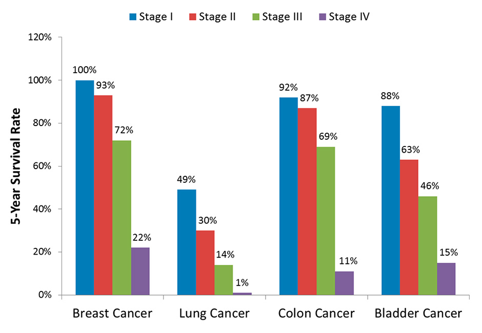 Five-year survival rate for common cancer types by stage at diagnosis (based on data from [30]).