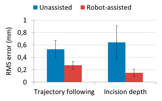 Experimental results demonstrating accuracy improvements in laser control provided by the IIT’s RALP system. (a) Root mean square (RMS) error on trajectory following experiments [68]. (b) RMS error on laser incision depth control [60].