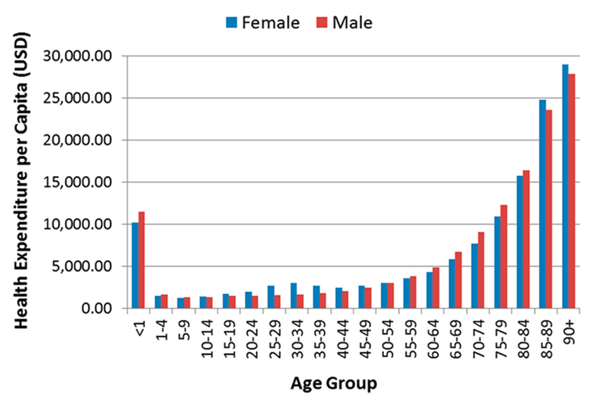 Canada’s public healthcare expenditure per capita per age group in 2013 (based on data from [2]).