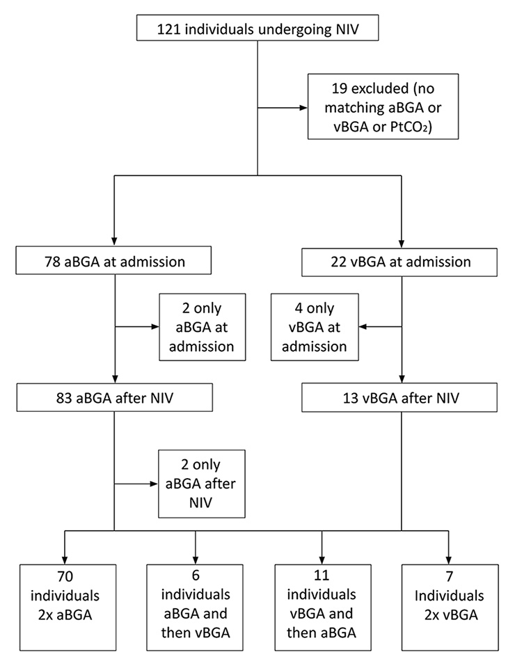 aBGA = arterial blood gas analysis; NIV = noninvasive ventilation; PtCO2 = transcutaneous partial pressure of CO2; vBGA = venous blood gas analysis