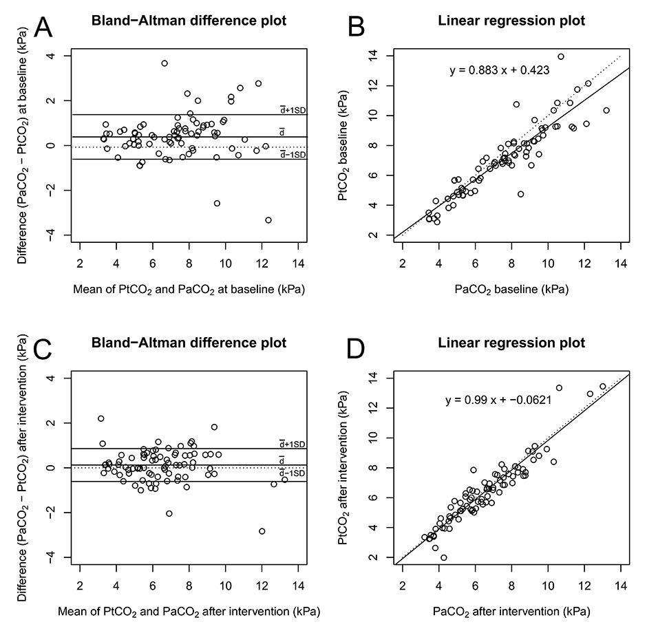 Comparison of transcutaneous and invasive PaCO2 at baseline and after intervention. Measurements were compared using both a Bland-Altman plot (A, C) and a linear regression plot (B, D). A and B at baseline, C and D after NIV. The Bland-Altman plot displays the mean bias and limits of agreement (solid lines). The linear regression plot displays the line of best fit (solid line) and the identity line (dashed line).