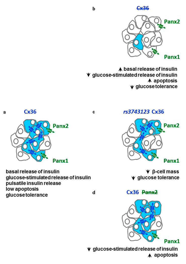Cx36 and the insulin-producing β-cells. (a)The most abundant endocrine cell type of pancreatic islets, named β-cells, are only coupled by Cx36 channels, and also express Panx2 and Panx1. (b) Loss of Cx36 increases (upward arrow heads) or decreases (downward arrow heads) the major characteristics of β-cells (Cx36-coupled cells are shown in blue), notably insulin secretion and apoptosis. (c) These alterations are also observed in rodents and humans when β-cells express the rs3743123variant of Cx36.The β-cell changes observed under such conditions mimic the major defects of type 2 and type 1 diabetes. In vitro, cells expressing this Cx36 variant are less coupled than cells expressing comparable levels of the wild type Cx36 form. (d) Loss of Panx2 also results in a decrease of glucose-stimulated insulin secretion and in an increase of β-cell apoptosis. Reverse transcriptase-polymerase chain reaction analysis indicates that Panx2 and Panx1 may be co-expressed with Cx36 by individual β-cells, although a validation of this tentative conclusion awaits the development of fully specific antibodies against the two pannexin species.