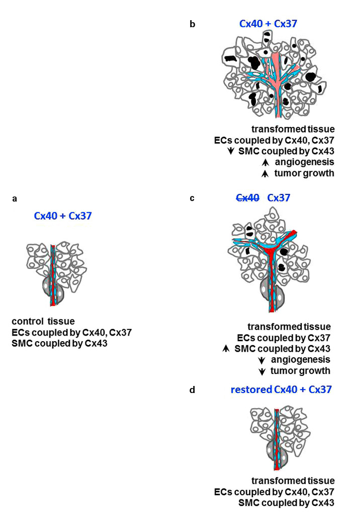 Cx40, cancer growth and angiogenesis. (a)In most tissues, the endothelial cells of micro vessels are coupled (blue) by Cx37 and Cx40 channels. (b) The tumoral growth of transformed tissues is usually associated with the proliferation of endothelial cells, resulting in the excessive development of new vessels, which feature abnormal walls lacking pericyte (grey cells) coverage. (c) These alterations, and the growth of transformed cells are decreased after loss of Cx40, resulting in a prolonged survival of the tumour-bearing animals. (d) Restoration of Cx40 expression in endothelial cells, prevents both excessive angiogenesis and tumour growth.