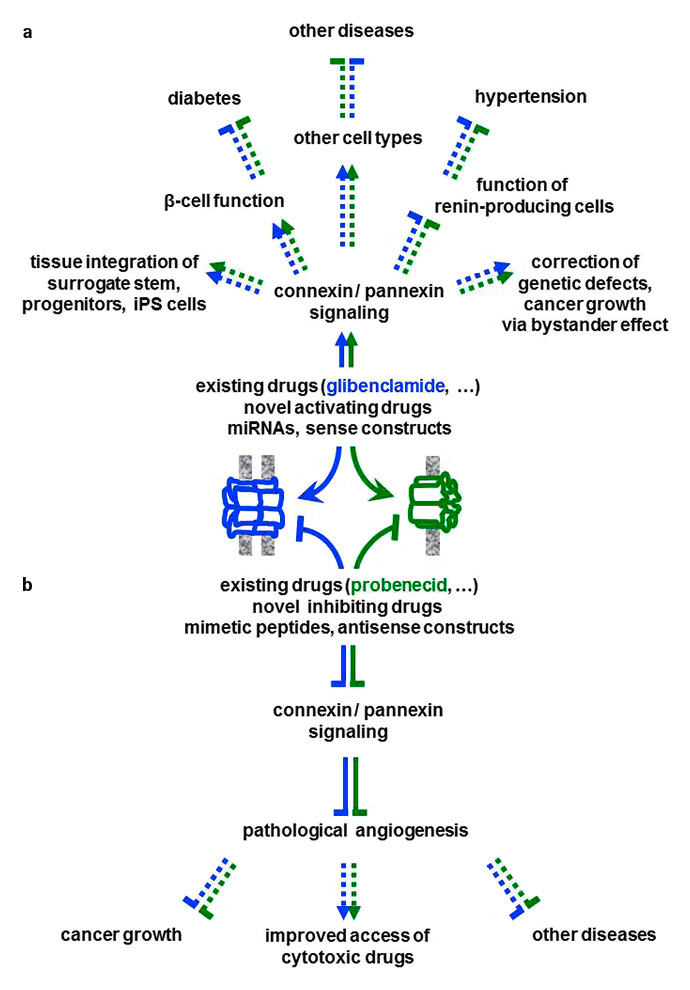 The translational perspectives. (a)The stimulation (arrows) of junctional and non-junctional channels (e.g. those formed by Cx36 and Panx2) is expected (dotted lines) to reproduce in humans the beneficial effects of connexin (blue) and pannexin (green) signalling observed in rodents. In turn, increasing the function of pancreatic β-cells is expected to improve the treatment of type 1 or type 2 diabetes. Increased connexin and pannexin signalling is also expected to foster the integration in the host tissues of surrogate cells designed for cell replacement therapies. (b) Conversely, the inhibition (flat-end lines) of selected connexin species (e.g. Cx40) is expected to prevent the over-stimulation of the renin-producing cells, thus contributing to mitigate several forms of hypertension. The specific down-regulation of Cx40 is also expected to prevent excessive angiogenesis, while preserving a normal vessel wall and function, thus improving the efficiency of current cytotoxic therapies. This combined approach could reduce the growth of some cancer forms and the development of other diseases due to excessive angiogenesis.