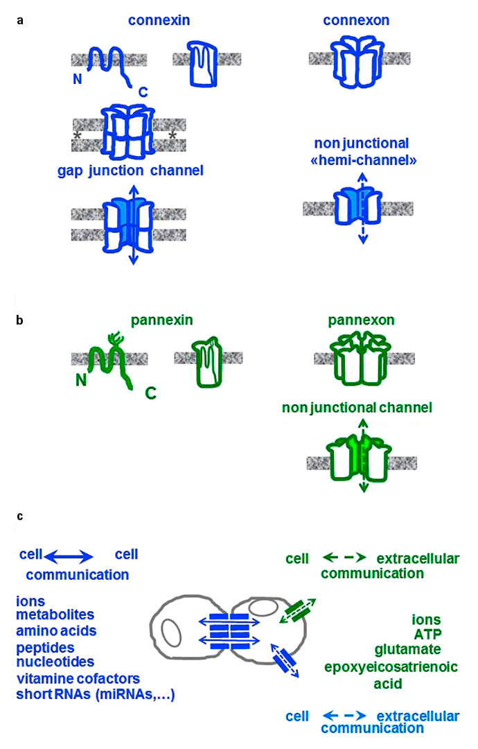 Proper adaptation of human tissues and organs to the changing conditions of the environment and of the milieu intérieur, of necessity depends on a communication network between the component cells, which cross-talk to coordinate and, at times, synchronise their activities [1, 2]. With evolution, this network has progressively diversified to form a complex array of cross-talking and to some extent overlapping cell communication mechanisms [3]. These mechanisms provide for the neural and hormonal signalling between distant cells, and for the more local signalling ensured by extracellular molecules that either interact with specific cell receptors, or enter cells equipped with ion-selective channels [4]. It is now appreciated that most cells are also equipped with connexins and pannexins, which form channels permeable to a large variety of molecules, and that either link two adjacent cytoplasms (connexins) or allow for the communication of cytoplasm with the extracellular fluid (pannexins and, occasionally, connexins) [5–7]. The striking evolutionary conservation of these proteins, their constant expression in all living animals, and the specific phenotypes resulting from their experimental modulation, indicate that connexins and pannexins are indispensable for the functioning of most vertebrate tissues. The increasing numbers of human diseases that have been associated with specific mutations and variants of these proteins, or with their quantitative and distribution changes, further stress their relevance for the clinic [8–14].