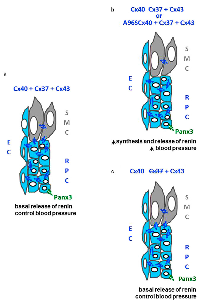 Cx40, Cx37, Cx43 and the renin-producing cells. (a)Within the renal cortex, renin-producing cells (RPC) are coupled by Cx37 and Cx40 channels, to companion cells and nearby endothelial cells (EC), and also express Panx3. The smooth muscle cells (SMC, grey) of the afferent arterioles are coupled by Cx43 channels to companion cells and to RPC. (b) Loss of Cx40 increases the major function of RPC, i.e. renin biosynthesis and secretion, resulting in persistent hypertension. These changes are also observed when cells express the A96Svariant of Cx40 (b), but not after deletion of Cx37 (c). The alterations in renin secretion observed under such conditions mimic those observed in most forms of hypertension.