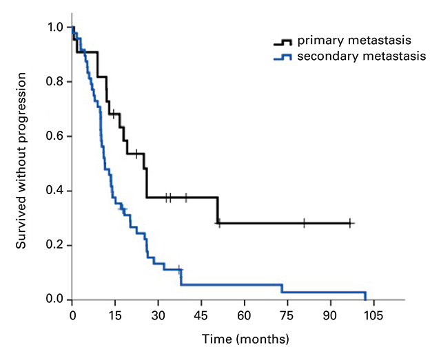 Kaplan-Meier curves for (a) overall survival for all patients, (b) progression-free survival (n = 70), and (c) progression-free survival of patients with primary metastatic disease vs patients with secondary metastatic disease, p = 0.006.