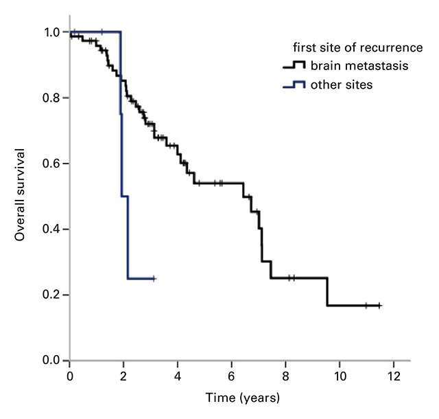 | Olson et al. [18] | Boston USA | 113 (1999–2005) | 3.5 years (3.0–4.4) | 8% as first site 55% in total | Brain metastases, number of sites of metastases, duration of first remission | |||