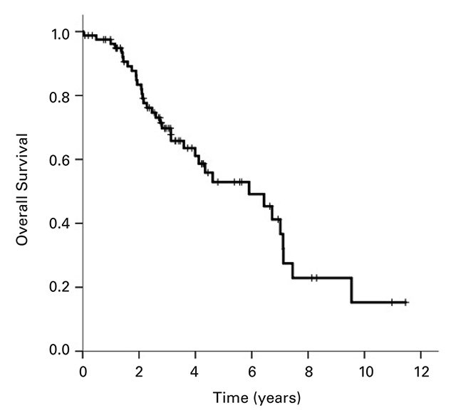Descriptive statistics were used for patient characteristics, tumour characteristics and details of the received therapy. Overall survival and other time-to-event endpoints were evaluated using Kaplan-Meier curves. To evaluate factors predicting long-term outcomes, the log-rank (Mantel-Cox) test was used to calculate the hazard ratio (HR) and p-values.