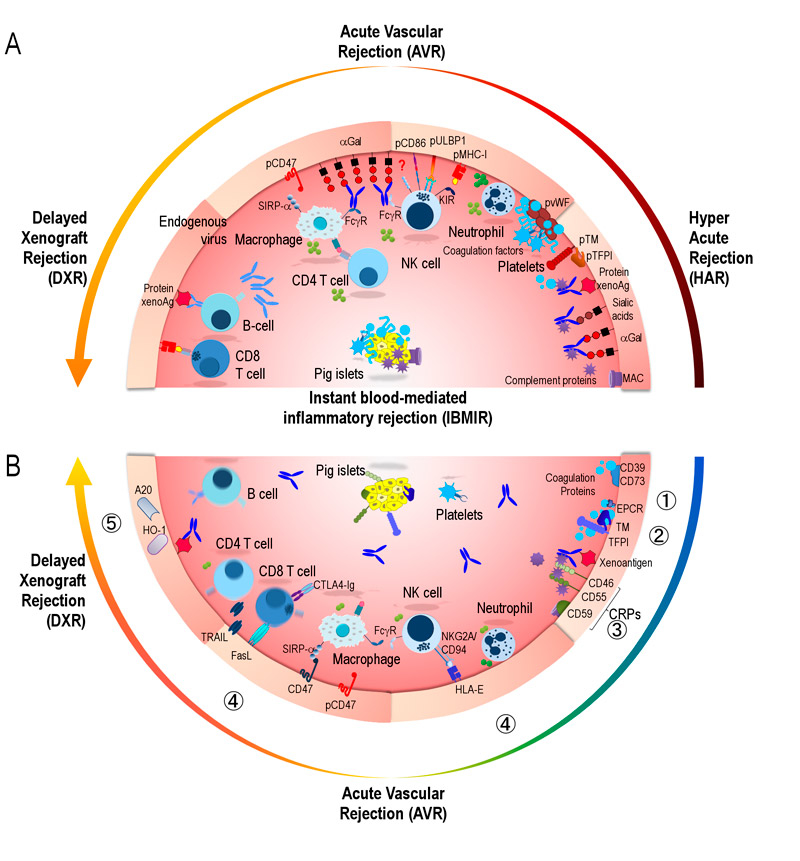 (B) Strategies to overcome xenograft rejection: ① Modification of xenoantigens by either masking or deletion, most importantly αGal in GalT-KO pigs. ② Introduction of human coagulation regulatory proteins, CD39 and CD73, to avoid platelet aggregation; thrombomodulin (TM, CD141); and endothelial protein C receptor (EPCR, CD201) to promote the activation of human protein C which degrades clotting factors; tissue factor pathway inhibitor (TFPI). Deletion of pig von Willebrand factor inducing to human platelet aggregation. ③ Expression of human complement regulatory proteins (CRP), CD46 (MCP) and CD59 to inactivate complement factors, CD55 (DAF) to accelerate complement decay. ④ Control of cellular responses by induction of apoptosis using FasL (CD178) or TRAIL (CD253) expression; blocking of T cell co-stimulation with CTLA-4-Ig or LEA29Y; expression of HLA-E to inhibit NK cells via the inhibitory NKG2A/CD94 receptor; and human CD47 to regulate macrophages via SIRPα. ⑤ Expression of antiapoptotic A20 to protect porcine endothelial cells from TNF-mediated apoptosis or anti-inflammatory HO-1 to degrade free haem.