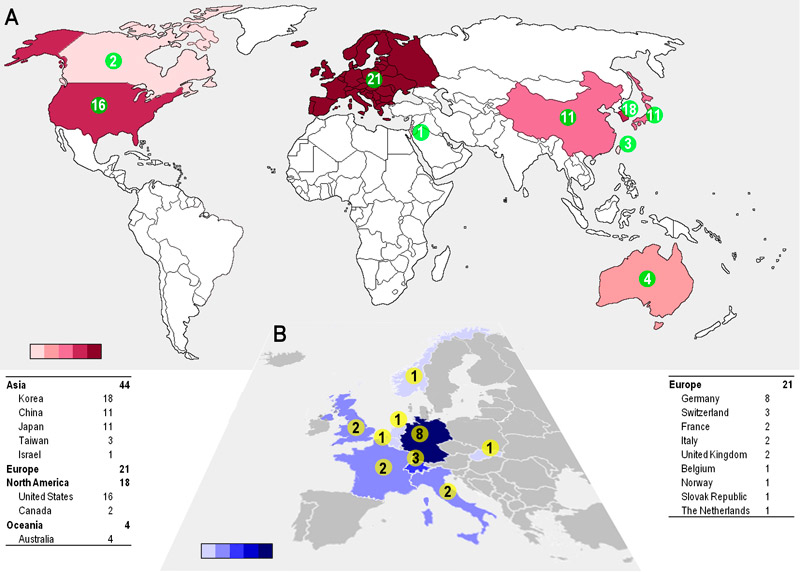 To illustrate the ongoing research efforts in the field we analysed the affiliation and geographical location of the speakers and poster presenters at the above-mentioned IXA meeting in Melbourne. A map showing the countries and numbers of groups active in xenotransplantation research demonstrates that Asia is the leading continent, followed by Europe and North America; South Korea alone seems to have a similar number of research groups as the US (fig. 3A). Within Europe, Germany is in the lead, (fig. 3B), but Switzerland stands out when data are adjusted for the number of inhabitants. However, the value of these data is limited, because participation of researchers at the Melbourne meeting depended on several factors, including country of origin and costs of registration and travel. Furthermore, venture capitalists and shareholders have renewed their interest in xenotransplantation, which is reflected by new companies investing in the field. Remarkably, the big pharmaceutical companies are still watching without participating, and industry is mainly represented by small- and medium-sized biotechnology companies.