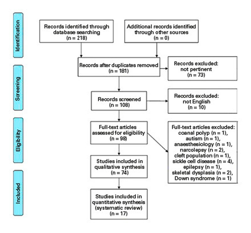 A flow chart of our criteria and results are summarized in figure 2. A total of 181 published articles were found; 98 of these were assessed for eligibility, but 24 of them had to be excluded after an attentive reading of the title, abstract and/or full text because the information did not concern the four questions that were the basis of our research. Finally, we found 17 studies regarding the urological outcome of treatment for obstructive SDB in children with enuresis.