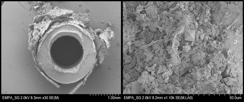 Figure 3 Example of a cross-section of a ureteral stent (left image) and a scanning electron micrograph of the stent biofilm (right image).