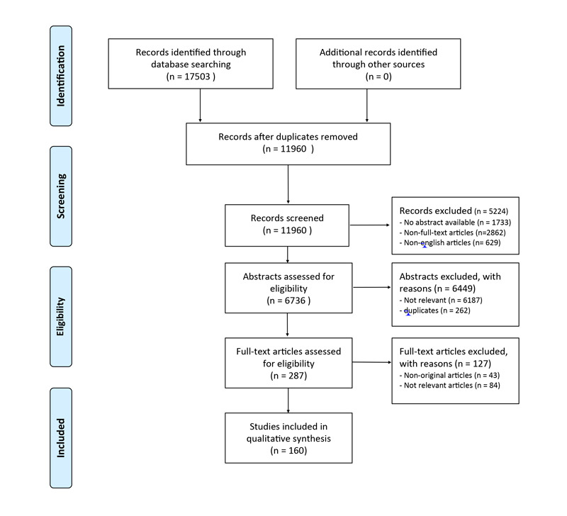 We identified 17 503 records through database searching, with 160 articles finally included in this systematic review. The PRISMA flow diagram is shown in figure 1.