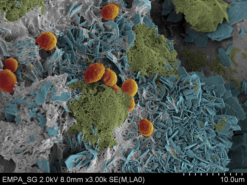 Figure 2 Colourised scanning electron micrograph of a stent biofilm showing microbes (highlighted in orange), hexagonal carbonate hydroxyapatite crystals (blue) and amorphous crystal-like structures (green). For imaging, stent sections were fixed with glutaraldehyde and formaldehyde in phosphate-buffered saline, followed by Au/Pd sputtering after chemical dehydration.