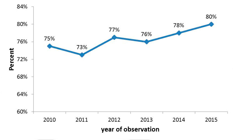 Figure 3 shows the prevalence of orally anticoagulated study participants between 2010 and 2015 among those with an indication for OAC. The prevalence of OAC was already high in 2010 and increased nonsignificantly afterwards (75%, 73%, 77%, 76%, 78% and 80%, p = 0.2).