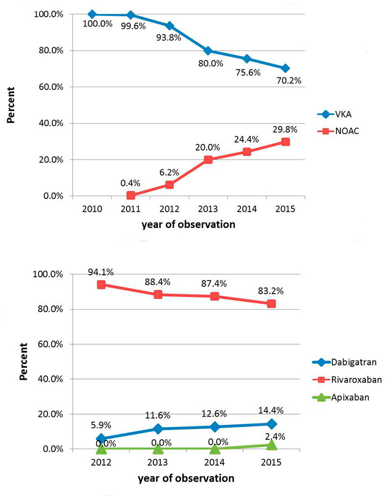 There has been a steady increase of NOAC use during the last 5 years. Our study has the advantage of directly assessing the transition period before and after regulatory approval of NOACs. Most published studies were conducted during the first years after approval of the new agents. In the transition period between 2011 and 2013, the OAC distribution pattern in our cohort is in line to other western European countries [19, 20]. Studies that focused on atrial fibrillation newly diagnosed after NOAC approval reported a higher proportion of NOAC use [12, 17, 21], which is in line with our study showing that patients on VKA treatment are relatively rarely switched to NOAC therapy.