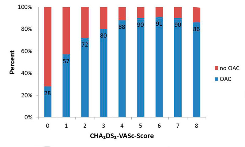 Figure 2 Oral anticoagulation (OAC) according to CHA2DS2-VASc score at baseline.