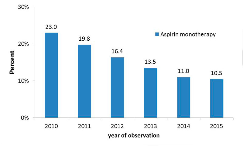 The use of low-dose aspirin as a monotherapy significantly decreased over time, as demonstrated in figure 5. In 2010, 23% of the study participants had monotherapy with aspirin, and this proportion decreased to 10.5% in 2015 (p <0.0001).