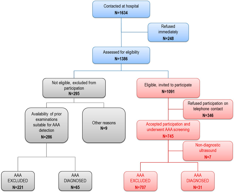 Three hundred and forty-six (32%) of the 1091 eligible patients contacted by telephone to arrange the appointment for the ultrasound scan did not confirm their participation or did not attend the scheduled visit; 745 (68%) underwent the planned ultrasound scan of the abdominal aorta. The study flow is summarised in figure 1. A previously unknown AAA was diagnosed in 31 screened patients (4.2%, 95% CI 2.8–5.9).