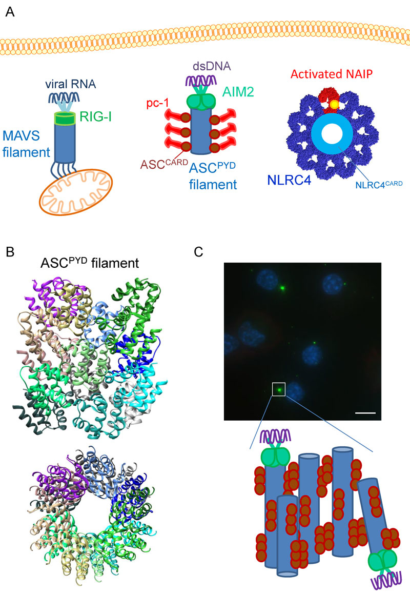 Figure 2 Innate immunity signalling platforms with a prionoid character. (A) The schematic representation of the assembly of RIG-I-nucleated MAVS filament (left), AIM2-nucleated ASC filament (middle), and NAIP-nucleated NLRC4 oligomer (right). In each case, nucleators are first activated by respective PAMP binding. The scheme of NLRC4 is based on the NLRC4 oligomer structure (PDB: 3JBL [85]). (B) The structure of ASCPYD filament as determined by electron microscopy (PDB: 3J63 [87]) reveals a hollow three-start helical assembly. (C) Upon activation of nucleators, ASC is recruited to perinuclear region to form ASC specks (immunofluorescence-labelled endogenous ASC specks are shown in green and nuclei are depicted in blue, bar represents 10 μm). Upon activation of PYD-containing receptors such as NLRP3 or AIM2, ASC specks are formed by the polymerisation of ASCPYD domains and crosslinking of ASCPYD filaments by ASCCARD domains [156]. Structural images were generated by use of UCSF Chimera [7].