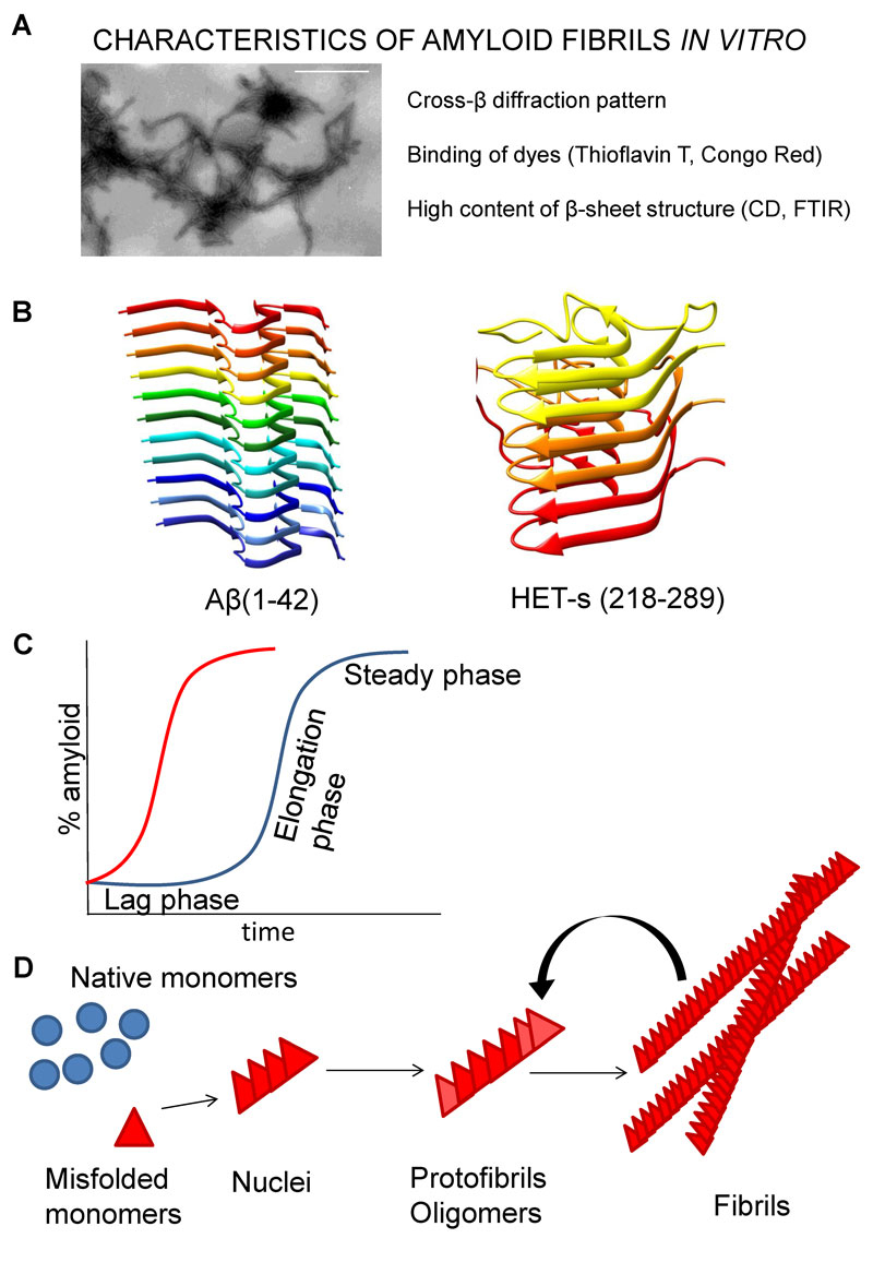 Figure 1 Characteristics of amyloid structure and polymerisation. (A) Amyloid fibrils (fibrils prepared from recombinant prion protein are shown, bar represents 500 nm) can be identified by transmission electron microscopy. Amyloids also have a characteristic X-ray diffraction pattern, bind amyloid-selective dyes and have a high content of β-sheet secondary structure, as determined by circular dichroism (CD) or Fourier transform infrared spectroscopy (FTIR). (B) Examples of amyloid structure (Aβ(1-42), fibril structure (PDB: 2MXU [5],), and HET-s (218-289) structure (PDB: 2KJ3 [6],) determined by solid-state nuclear magnetic resonance. Structural images were generated by use of UCSF Chimera [7]. (C) The kinetics of amyloid formation follow a typical sigmoidal curve (blue). The addition of preformed seeds shortens the lag phase (red curve). (D) A schematic representation of amyloid fibril formation. Misfolded proteins form a nucleus, which is able to capture and transform monomers. In the process of elongation, intermediate structures such as oligomers and protofibrils are formed, which further grow to mature fibrils. Mature fibrils are either spontaneously or enzymatically disintegrated, providing further perpetuation of amyloid formation.