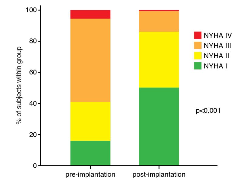 Figure 1 Clinical effects of cardiac resynchronisation therapy (CRT). Distribution of New York Heart Association (NYHA) class before and after CRT implantation (data available in 305 patients, 73%). Median follow-up time of 6 months. Wilcoxon signed rank test.
