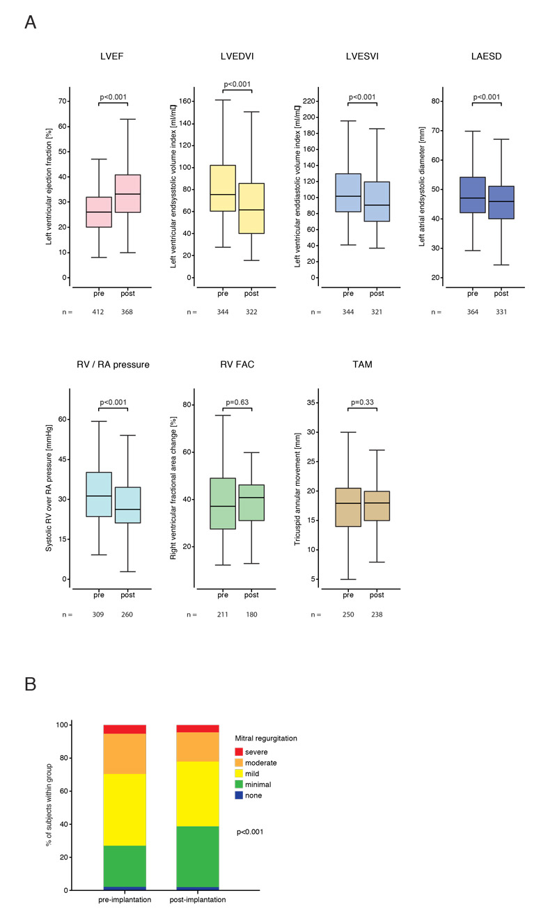 Figure 2 Effects of cardiac resynchronisation therapy (CRT) on echocardiographic reverse remodelling. Comparisons pre- vs post-CRT implantation of echocardiographic parameters of cardiac remodelling. (A) Comparisons of LVEF (left ventricular ejection fraction), LVEDVI (left ventricular end-diastolic volume index), LVESVI (left ventricular endsystolic volume index), LAESD (left atrial endsystolic diameter), RV/RA (systolic right ventricular over right atrial pressure), RV RAC (right ventricular fractional area change), TAM (tricuspid annular movement). (B) Comparison of mitral regurgitation. Wilcoxon singed rank tests. Box plots show interquartile ranges, whiskers indicate minimum and maximum values. Median follow-up time of 6 months. Follow-up echocardiographic data were available for 369 patients (88.3%).