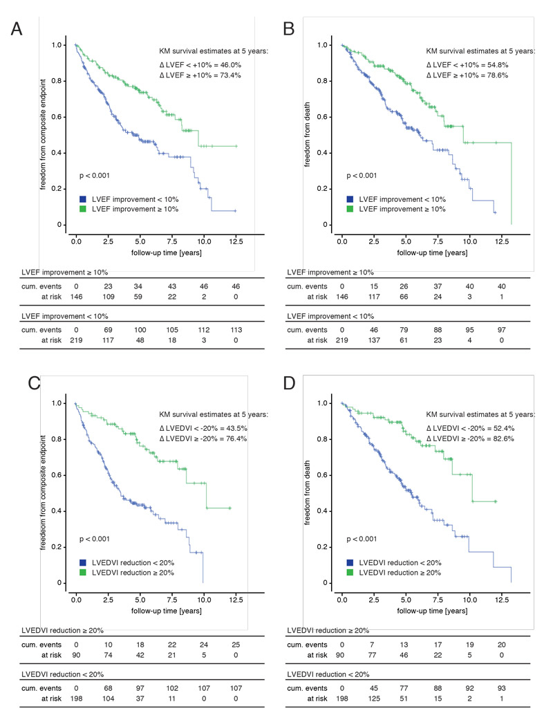Both groups of super responders – patients with an absolute LVEF improvement of ≥10%, and patients with a relative LVEDVI reduction of ≥20% – had a significantly improved survival and freedom from hospitalisation for heart failure compared with the corresponding control groups (fig. 4, table 2). Accordingly, 5-year estimates both for freedom from the composite endpoint of mortality or hospitalization for heart failure, as well as for mortality alone were higher in either super-responder group compared to the respective remaining patient population (fig. 4, table 2).
