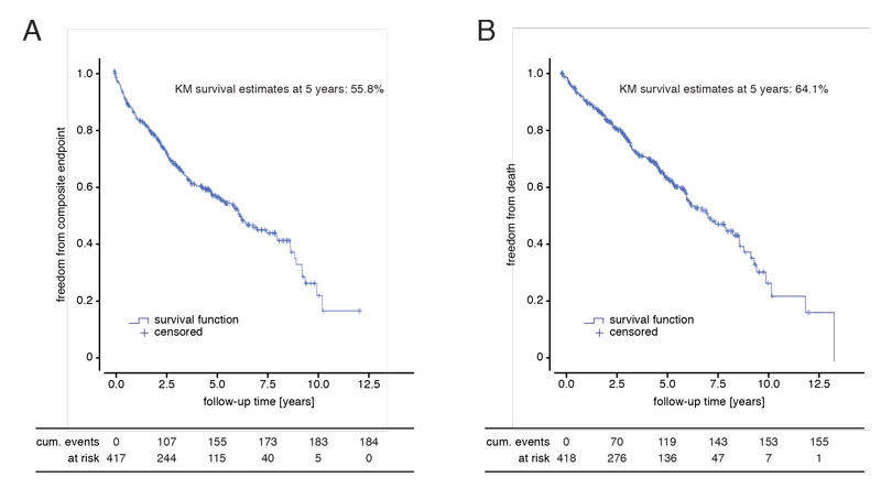 Figure 3 Follow-up for survival and rehospitalisation for congestive heart failure. Kaplan-Meier survival estimates for (A) the composite endpoint of hospitalisation for heart failure or all-cause mortality (defined as death, heart transplantation or ventricular assist device implantation) and (B) the endpoint of mortality alone. Follow-up began at the time point of cardiac resynchronisation therapy implantation. Median follow-up time was 3.6 years (interquartile range 1.9–5.7).