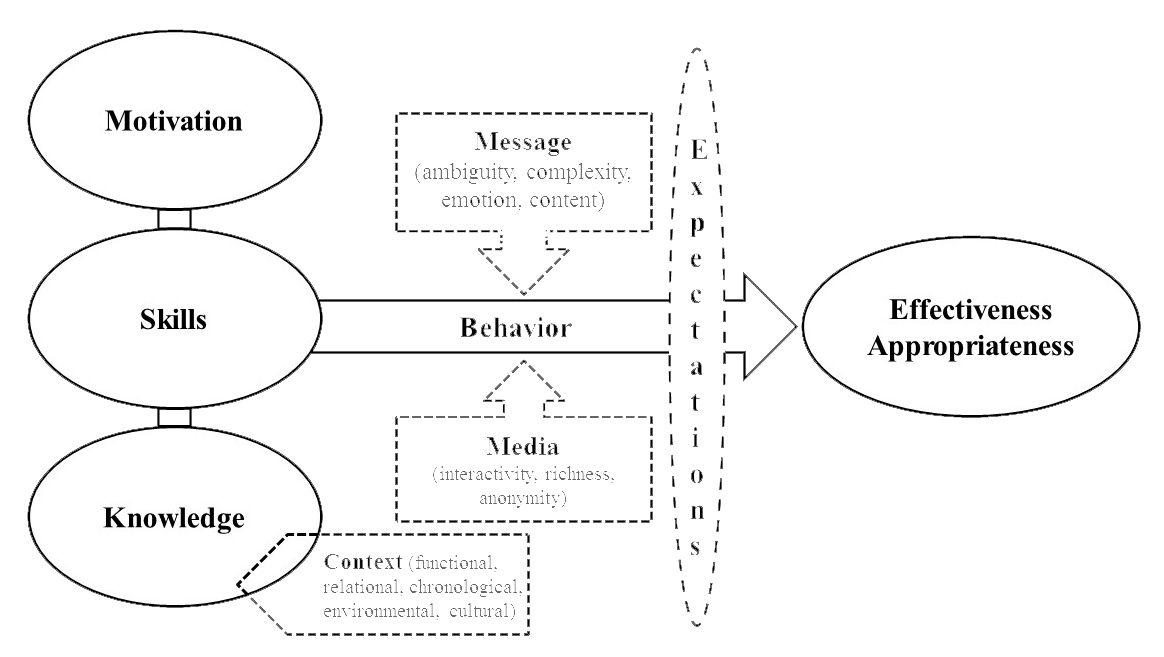 The communication competence model (CCM, fig. 1) is a core theoretical paradigm in the communication sciences. The model postulates that competence impressions are a function of each communicator’s motivation (rewards, costs), knowledge (symbols, roles, context), skills (attentiveness, composure, coordination, expressiveness), expectations and context. Context entails a number of dimensions: functional (e.g., compatibility of conversational objectives), relational (e.g., sense of connection, role interdependence, etc.), chronological (e.g., impositions of time in a given interaction), environmental (e.g., the physical environment and setting of a conversation) and cultural (e.g., rules, rituals, beliefs, and values of the interactants). Based on the CCM, motivation, knowledge, skills, expectations and context directly influence people’s impressions of a person’s communicative competence [31].