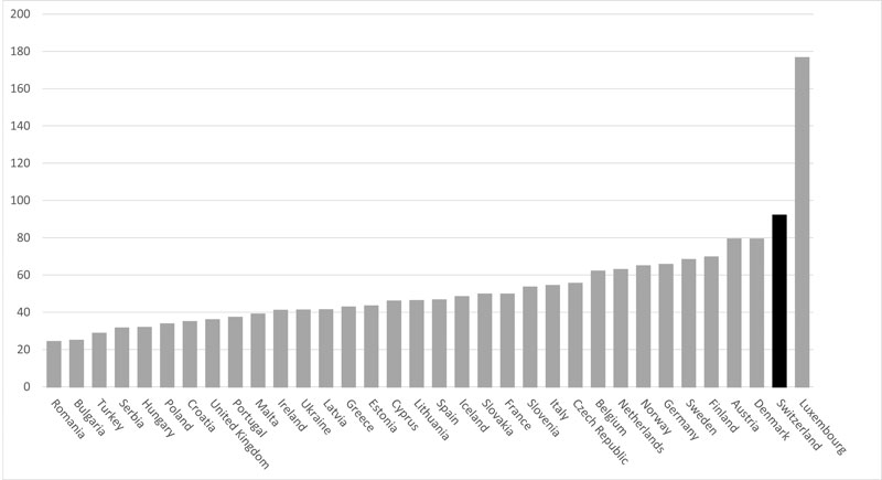Figure 2 European countries ranked by index of affordability of tobacco products (vertical axis: number of 20-packs that can be purchased with 1% of GDP per capita). Source: WHO Report on the Global Tobacco Epidemic, 2015 [10].