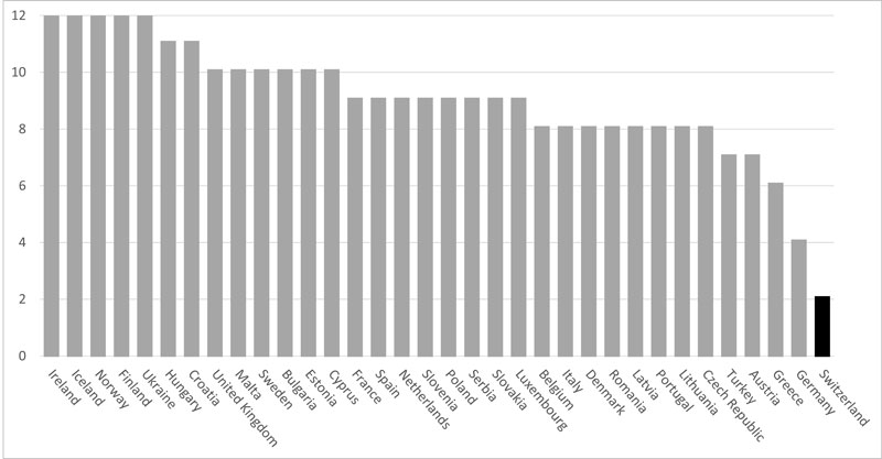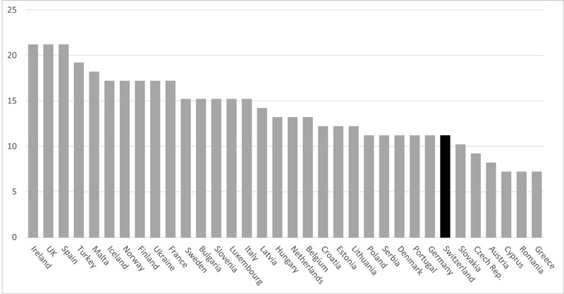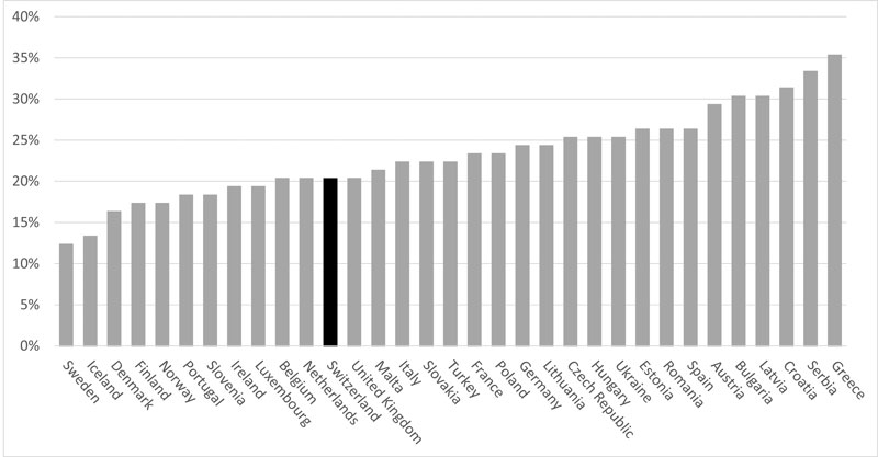 Every year, more than 9000 persons die in Switzerland because of tobacco-related illnesses, which account for around 15% of all deaths in this country [1]. Furthermore, 300 000 people can be conservatively estimated to suffer from a serious smoking-related disease [2, 3]. (The US Surgeon General in his 2014 report [2] estimated that for one death attributed to smoking, there were 30 people suffering from a serious smoking-related illness; we applied this proportion to the number of deaths caused by tobacco smoking in Switzerland.) This is likely to be an underestimate. Indeed, the Swiss Lung League [3] estimates that 400 000 persons suffer from chronic obstructive pulmonary disease (COPD) alone, a disease which is mostly caused by smoking (80 to 90% of persons with COPD are smokers).) According to official statistics, smoking prevalence in Switzerland is among the lowest in Europe (about 25% [4–7], 28% is the average in Europe [8], 34.1% in France for age group 15–75 years [9]); adult daily smoking prevalence appears to be lower in Switzerland than in most European countries, including all its neighbouring countries [10] (fig. 1). Addiction Monitoring in Switzerland (AMIS), the consortium of organisations mandated by the Swiss Federal Office of Public Health (FOPH) to establish prevalence statistics, states on its website [11] that “Available data on smoking prevalence in the countries neighbouring Switzerland (Germany, France, Italy and Austria) suggest proportions of smokers relatively similar to the Swiss figures or significantly higher, particularly in France.” If smoking prevalence is taken as the indicator of success in tobacco control, Switzerland might appear to be doing as well as or better than its neighbours and better than most European countries. This observation was recently made by the Swiss Senate when rejecting a proposed tobacco product law: the senators considered current smoking prevention measures as effective and thus concluded there was no need to change them [12].