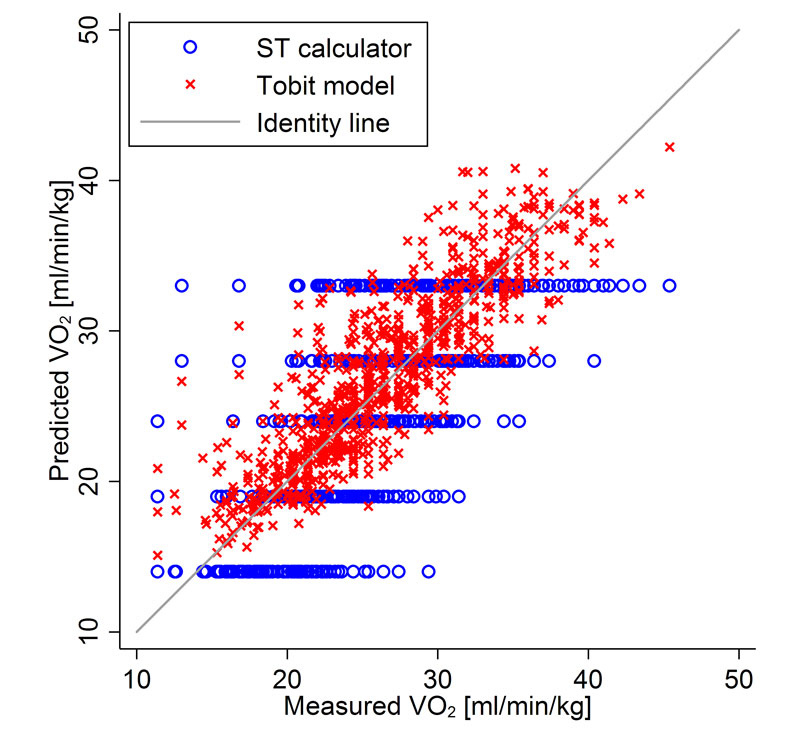 Figure 2 Comparison between the VO2peak values predicted by the ST calculator and the Tobit model.