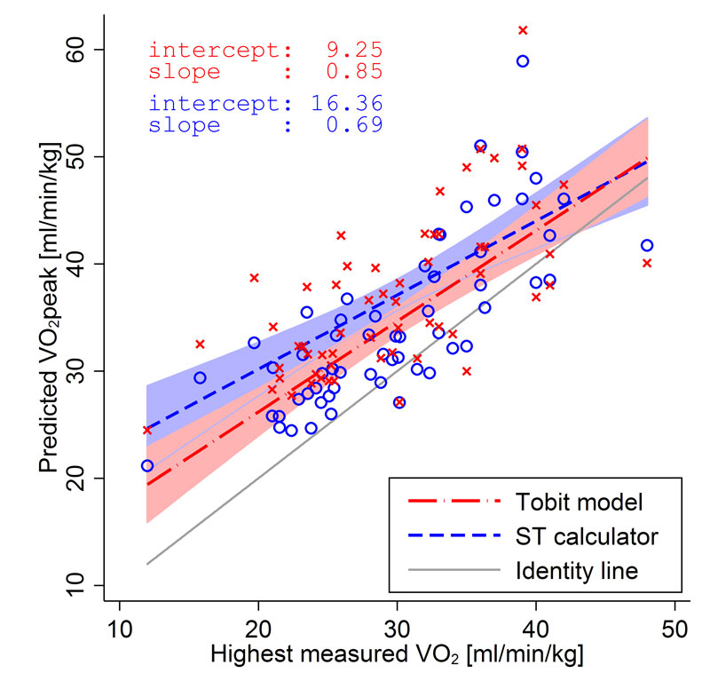The predictions were obtained with the Tobit model (present study) (crosses and red line) or with an equation developed from data reported in the literature (ST calculator, open circles and dotted blue line), using the measurements of the first three intensity levels only (sub-maximal test). The grey line represents the identity line.