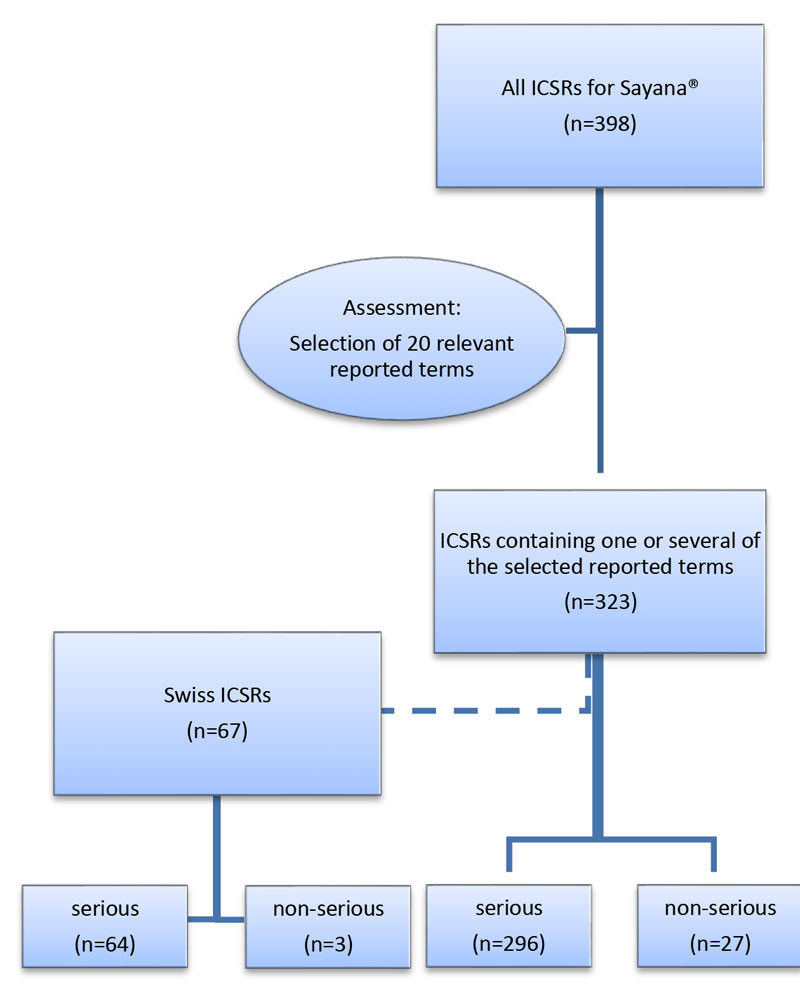 We received the coded data elements of all international Sayana®-associated ICSRs from the WHO global database VigiBase™ as a Microsoft Excel file via VigiLyze™. The case selection process is illustrated in figure 1. All reported terms were discussed independently by two pharmacists and one clinical pharmacologist, to determine if they could be used to describe a persistent injection site reaction, comparable to those reported to the RPVC Zurich. Twenty reported terms were regarded as relevant and the corresponding ICSRs were selected for further study. From the selected ICSRs, a subgroup containing only ICSRs from Switzerland was formed. Both data sets were analysed for demographic data such as age at ADR onset and gender, completeness, reported ADR, outcome, concomitant drugs, seriousness and seriousness criteria. The adverse reactions were classified as “severe” owing to the persistence of the condition of lipodystrophy and tissue damage.