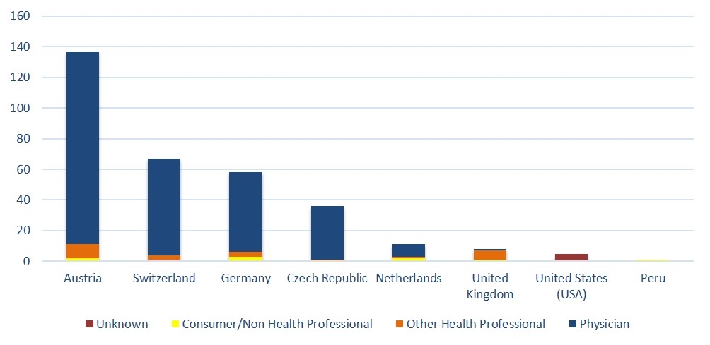 Figure 2 Number of individual safety reports stratified by country of origin and reporters’ qualifications.