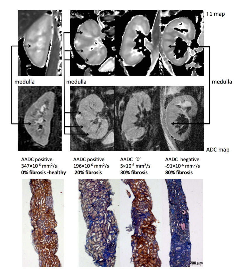 Magnetic resonance imaging (MRI), with use of various sequences including T1 mapping, blood oxygenation level dependent and diffusion-weighted imaging, is emerging as a promising non-invasive tool to assess kidney interstitial fibrosis.