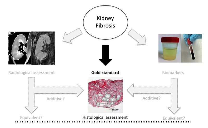 Figure 3 Kidney fibrosis is currently evaluated by histological assessment. Novel tools such as biomarkers or MRI are emerging. The place of these tools in the assessment process has yet to be determined as compared with the gold standard.