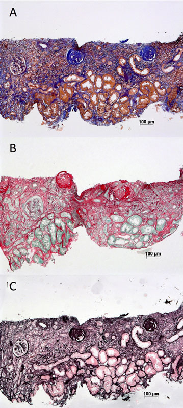 Figure 1 Examples of commonly used stains for histological assessment of renal interstitial fibrosis. (A) Trichrome. (B) Sirius red. (C) Silver methanamine.